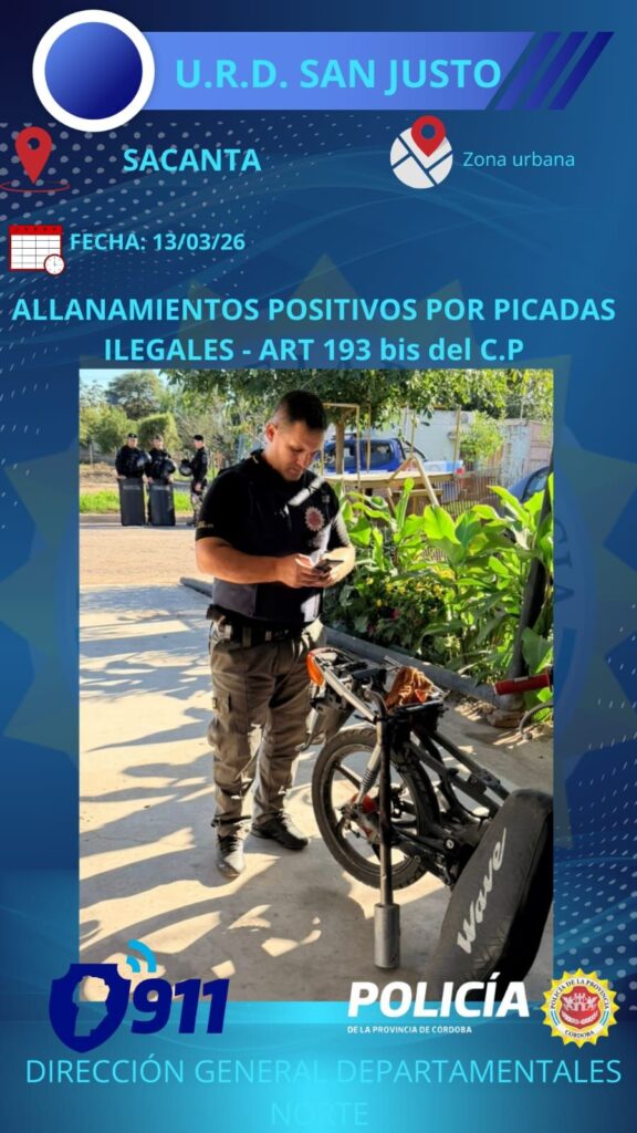 En la fecha,en horas de la mañana personal de la Subcomisaría Sacanta a cargo del Sub Crio. Milton Ullua, junto a efectivos de la dependencia, División Investigaciones y personal de Guardia de Infantería a cargo del Crio. Rodolfo Battán, tras un arduo trabajo investigativo proceden a cumplimentar cinco (05) órdenes de allanamiento dispuestas por Fiscalía de la ciudad de Las Varillas, a cargo de la Dra. Cecilia Dupraz.
